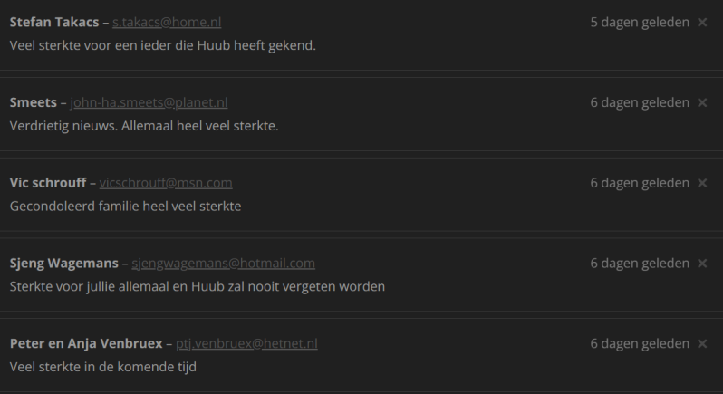Met het heengaan van Huub verliezen we een zeer gewaardeerd lid. Zijn jarenlange inzet en passie zullen altijd herinnerd worden. We wensen zijn vrouw Annie, dochter Cindy en schoonzoon Roy veel sterkte toe in deze moeilijke tijd.